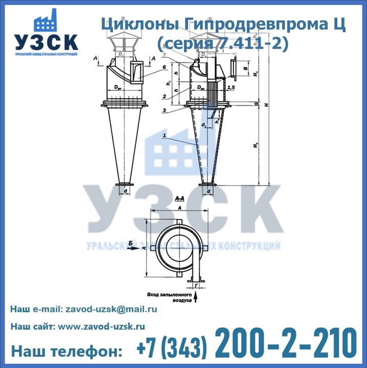 Циклоны Гипродревпрома Ц (серия 7.411-2) высокого качества можно купить в компании «УЗСК» в Туле. Наши специалисты предоставят всю необходимую информацию информацию и помогут с выбором модели циклона. Подробные технические характеристики, конструкцию, параметры, ассортимент и стоимость продукции можно также найти на сайте УЗСК.