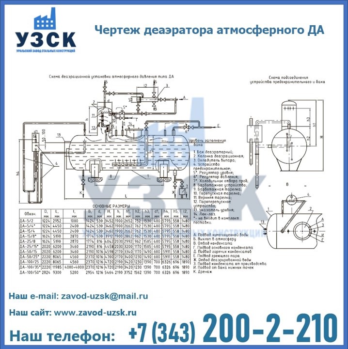 Приобрести качественное оборудование, в том числе, деаэраторы ДА, можно в компании УЗСК в Туле. Мы предлагаем долговечную и надежную продукцию по приемлемой цене. Заказать и купить деаэраторы или другие изделия высокого качества можно через сайт Уральского Завода Стальных Конструкций, или позвонив по указанному в разделе «Контакты» телефону.
